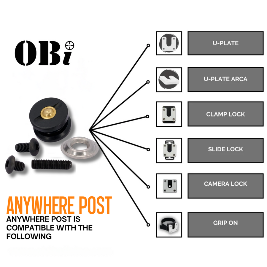 The OBi LINK SYSTEM--AnyWhere Post can be attached to various gear. It attaches by either a bolt or a threaded stud. Once the AnyWhere Post is attached, you can connect it to any of the Locks in the OBi lineup.