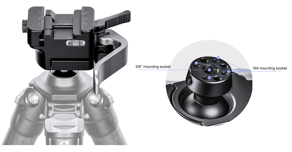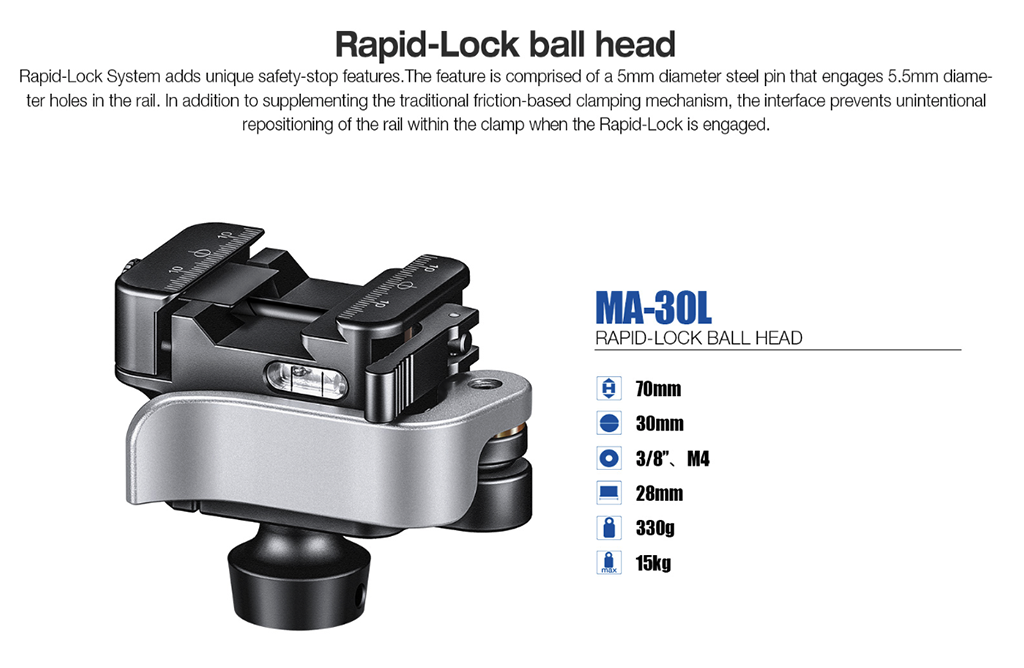 The Rapid-Lock system from Leofoto offers unique safety stop features. The interface avoids unintended repositioning of the rail within the clamp when the quick-lock is engaged. The lock knob on the MA-30L locks and unlocks the clamps.